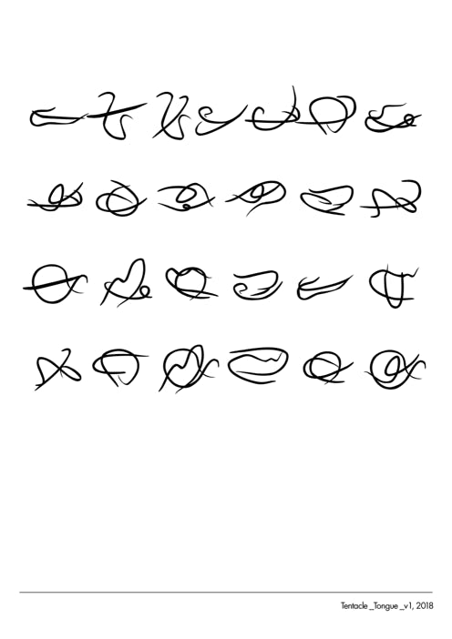 Since 2016 one strand of Tuomas A. Laitinen’s artistic practice has touched upon the research into cognition and consciousness in other-than-human minds, focussing on octopuses in particular. This endeavour is emerging through different material agencies: glass objects made for octopuses, multiple video and audio works, and a series of glyphs—made both as a font and as glass objects—derived from research on octopus arm movements.