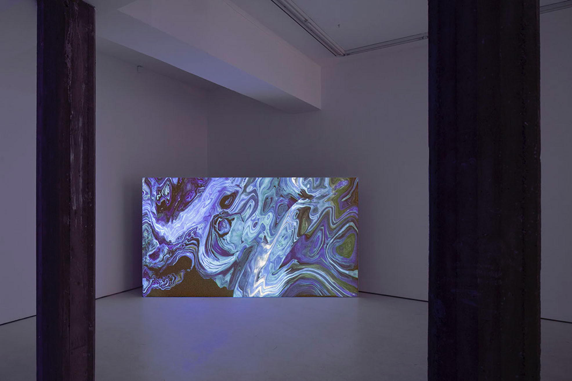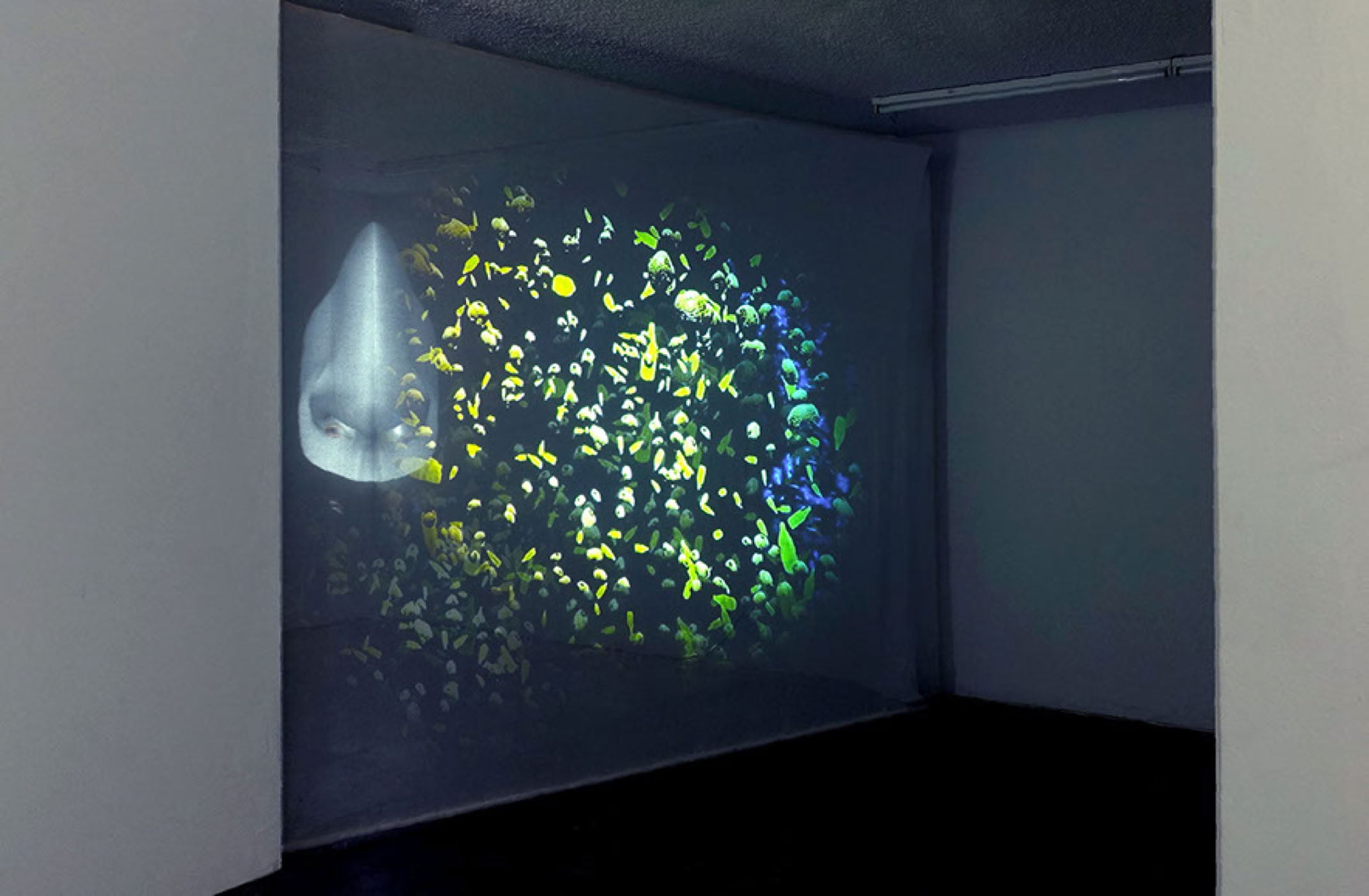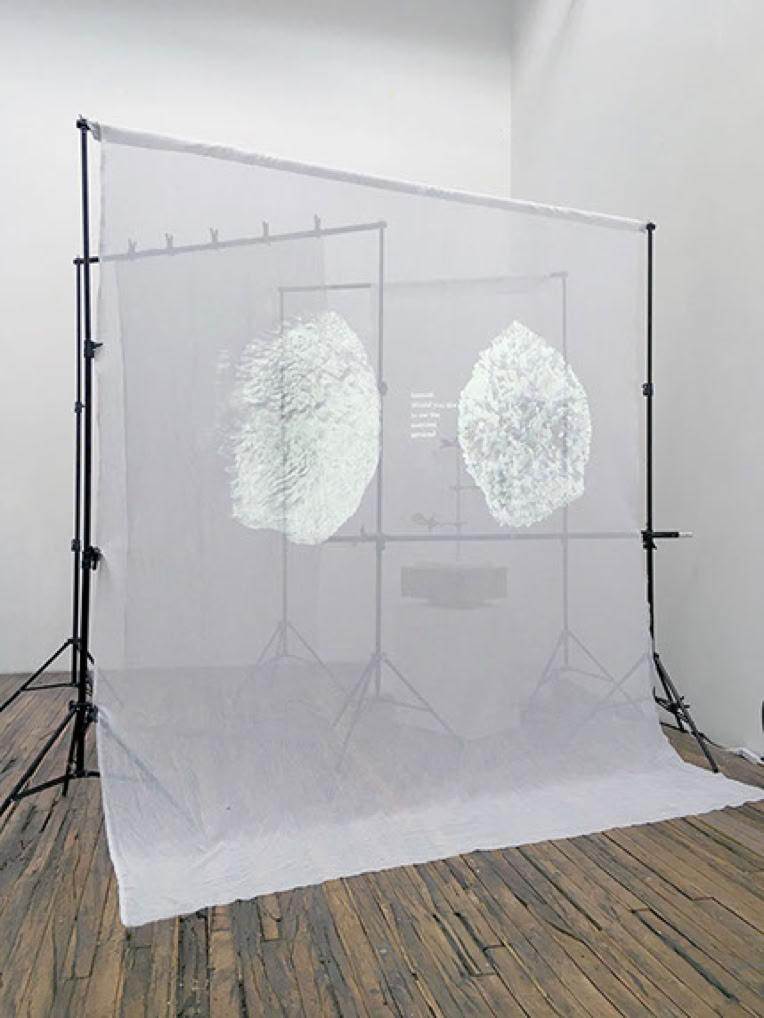 Sound is an integral part of the work. An ultrasonic speaker scans the space emitting glass sounds created in collaboration with an algorithmic system. Embedded within its layers, Dossier of Osmosis also includes text elements by writer Nora N. Khan.