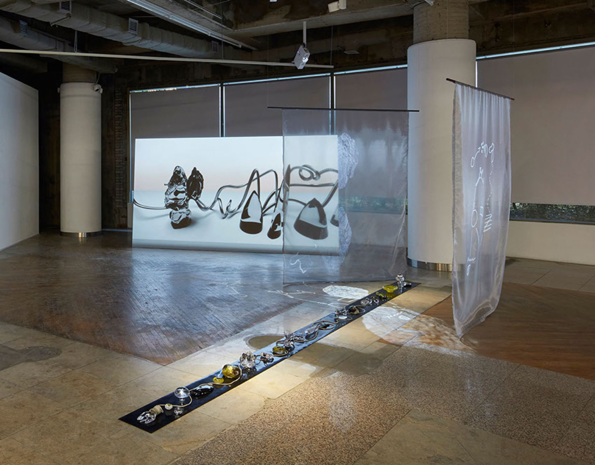 ΨZone is like an alien zone or a giant microscope. The work examines the formation of knowledge within complex systems. The material components – computer-simulated proteins, audio recordings of soil, water and chemical reactions transmitted via ultrasonic speakers, and shapes stored in glass – are inextricably entwined in a symbiotic web.