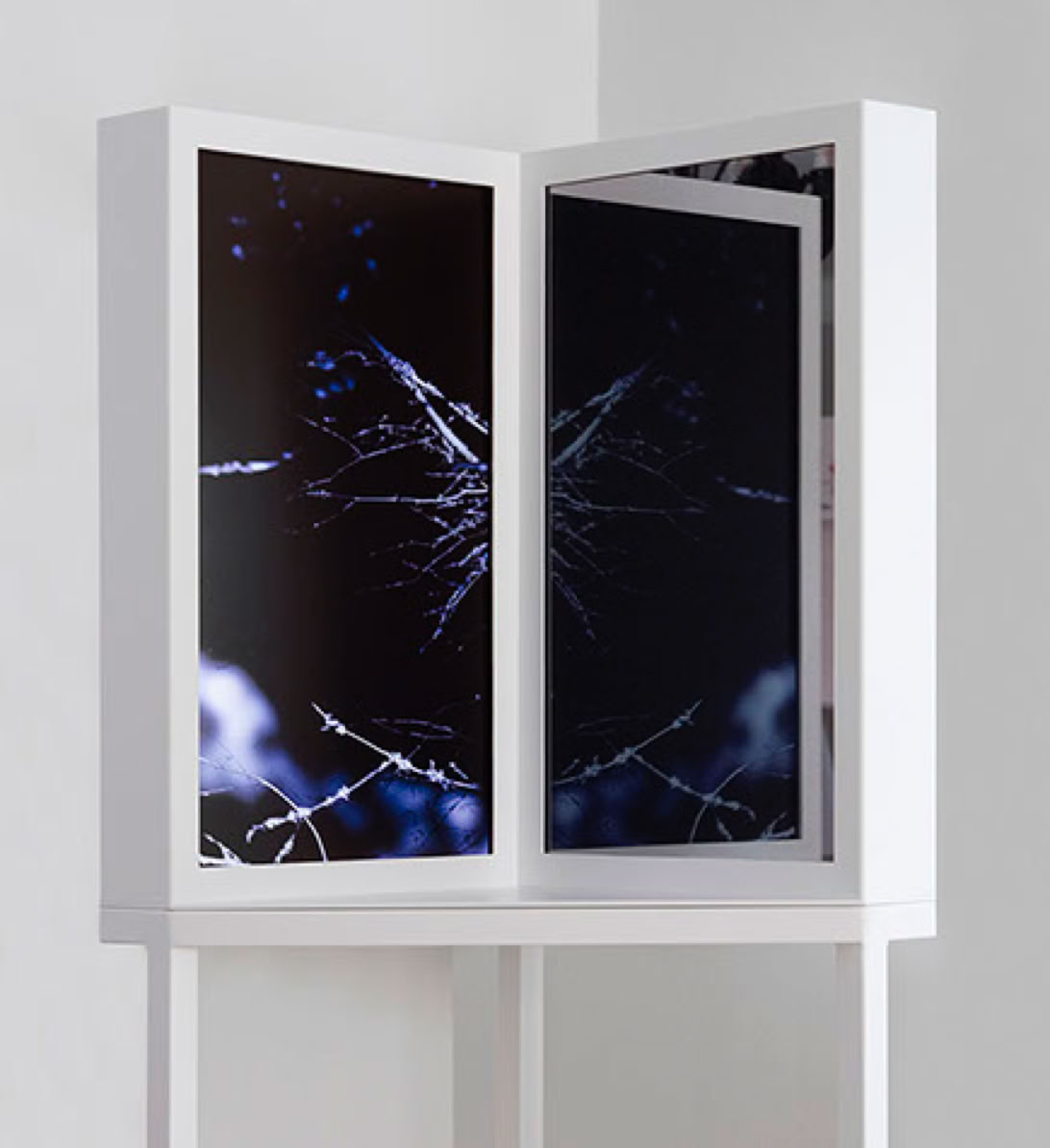 Motorized lightbox works are examining the fabrications of moving image before cinema or video. These works are indebted to 19th-century technologies for producing mechanical moving images as spectral apparitions. Transparent UV-prints are placed inside the lightbox that has a cycling device designed for supporting light movement. The viewer sees the shadow of the print.